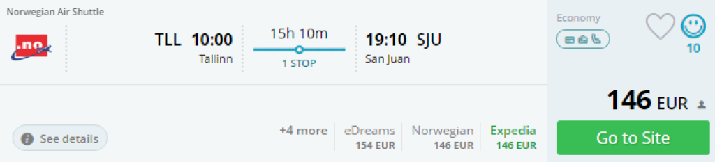 Norwegian pakub soodsaid lennupileteid Puerto Ricosse. Võimalik lennata Tallinnast hinnaga alates 335€. Vajalik soetada kolm üheotsa piletit: