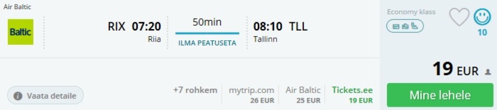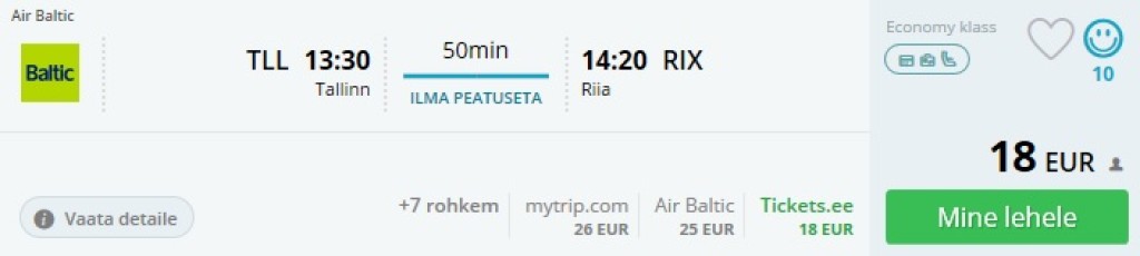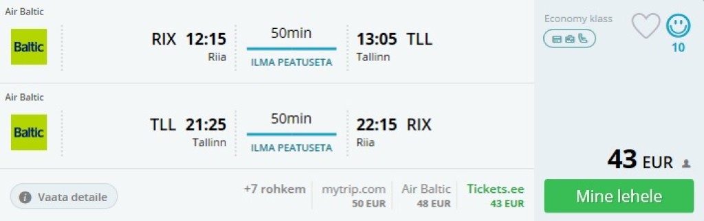 AirBalticuga saab nädalalõpuks Riiga lennata alates 43€ Ühe suuna hinnad algavad 18€. Välja on toodud hotellide hinnad pikaks nädalavahetuseks (N/R-P). Kuna AirBalticul on Tallinna ja Riia vahel päevas mitmeid lende, siis saab paljudel kuupäevadel valida sobiva lennu. Vahest saab mõned eurod kokku hoitud ka nii, kui osta kaks üheotsapiletit.