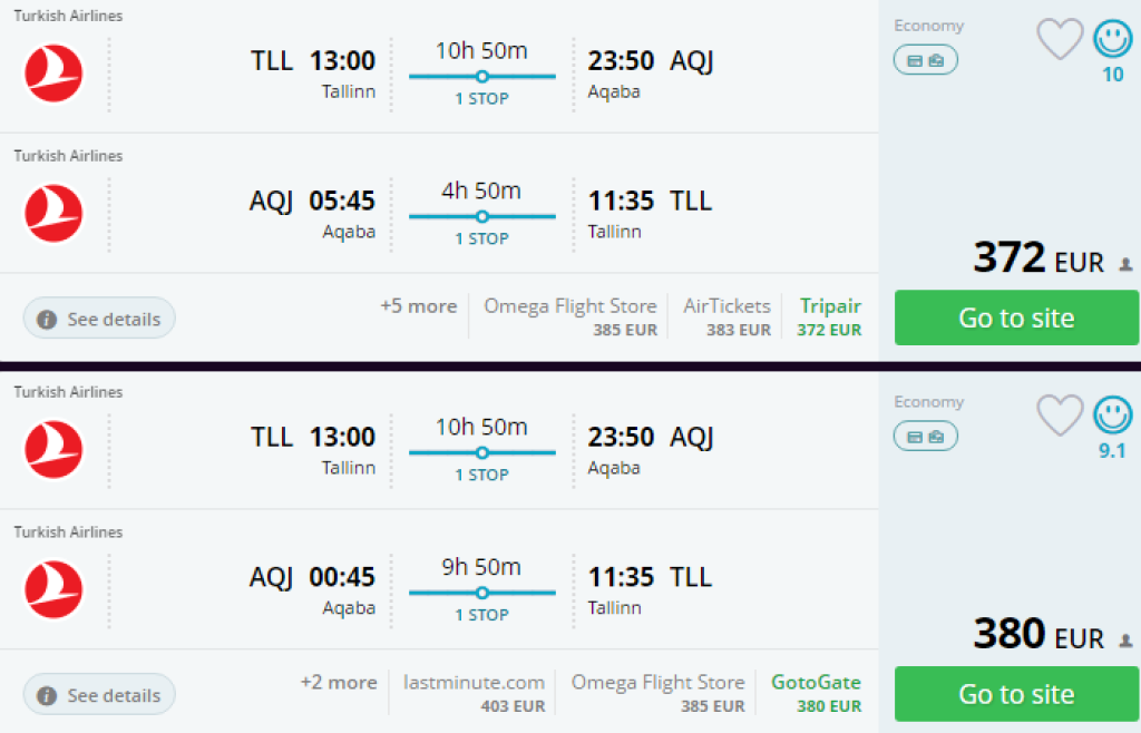Hetkel on saadaval väga soodsad lennupiletid Tallinnast Jordaaniasse, Aqabasse! Piirkond on puhkajate seas tuntud suurepäraste snorkeldamise ja sukeldumise võimaluste poolest. Edasi- tagasi lennupiletite hinnad algavad 372 eurost. Hetkel leidsime kaks lennukuupäevade kombinatsiooni märtsiks. Piletiteni jõudmiseks leidmiseks kasuta otselinke allpool või otsi lennupiletid üles momondo.co.uk abil.