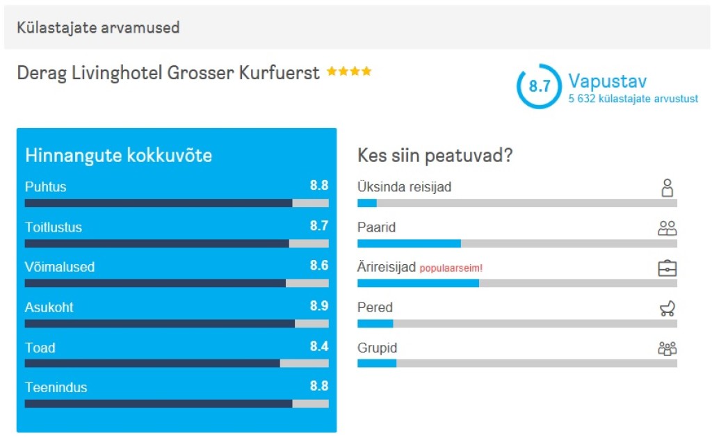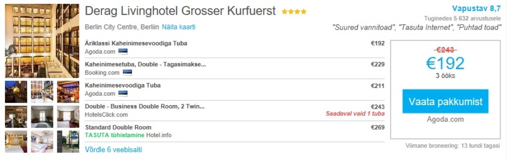 Suurepäraste hinnangutega 4-tärni hotellis (Tripadvisoris 4,5/5) Derag Livinghotel Großer Kurfürst maksab 3 ööd kahele 192€. Hotelli asukoht Spree jõe kaldal on suurepärane, paljud vaatamisväärsused on jalutuskäigu kaugusel. Kui on soovi kaugemale minna, siis kohe hotelli kõrval asub U-Bahni peatus.