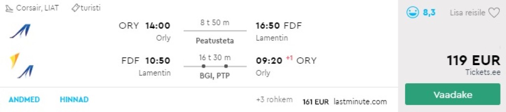 Hetkel võid leida veahinnad Pariisist Martinique'ile! Edasi-tagasi lennupiletid septembriks on leitavad al 119€ eest. Minnes on tegemist otselennuga, tagasiteel tuleb teha kaks ümberistumist. Hinnas sisaldub käsipagas! Parima hinnaga lennupiletid leiad üles läbi Momondo.ee või allolevate otselinkide kaudu.