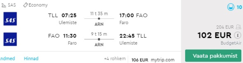 SAS pakub hetkel väga hea hinnaga lennupileteid Tallinnast Lõuna-Portugali, Farosse. Edasi-tagasi lennupiletid on saadaval alates 102€ eest. Soodsaid lennupileteid leidub novembris-detsembriks. Algarve rannikul paistab päike rohkem, kui 300. päeval aastas. Õhutemperatuurid kõnealusel perioodil on tavaliselt 15 soojakraadi ümber.Lennupiletite ostmiseks kliki allpool olevatel näidiskuupäevadel või otsi endale sobivad lennupiletid läbi Momondo.ee