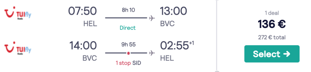 TUI pakub hetkel väga hea hinnaga viimase hetke lennupileteid Helsingist Roheneemesaartele, Boa Vistasse. Edasi-tagasi lennupiletid puhkuseks vahemikus 18.01-25.01 on saadaval vaid 136€ eest. Sellise hinna saab reisides kahekesi.