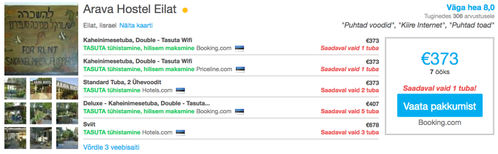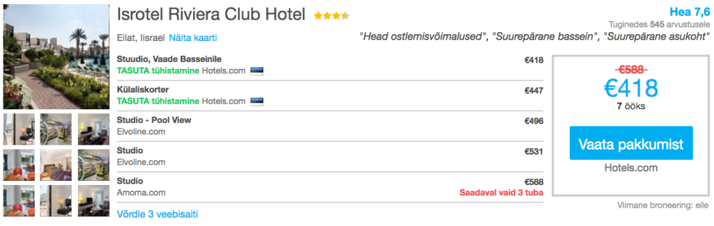Valisime näidiskuupäevadeks 25.11-02.12 (laupäev-laupäev 7 ööd)Lennupiletid hinnaga 100€ leiab SIITHotellisoovitused EilatisOtsisime välja ainult mõned pakkumised läbi HotelsCombined.ee hotelliotsingumootori. Otsi endale sobiv hotell läbi HotelsCombined.eeArava Hostel Eilat - väga hea reitinguga tuba kahele maksab vaid 373€. Vaata pakkumist SIIT