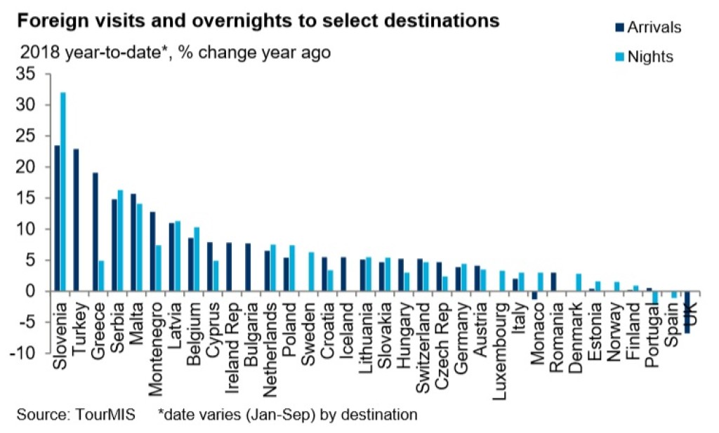 Euroopa Reisikomisjon avaldas ülevaate, mis on toimund Euroopa turismis 2018. aasta esimese 8 kuuga (jaanuarist augustini). Selgub, et Euroopa kõige kiiremini kasvav sihtkoht on Sloveenia, kus välisriikidest saabujate arv kasvas 23,5% ja riigis veedetud ööde arv 32%. Tõsi, sellisele kasvule aitas päris märgatavalt (hinnanguliselt 10% kandis) kaasa muutus statistika kogumise metodoloogias. Nimelt lähevad Sloveenias alates 2018. algusest arvesse ka kuni 10 kohaga majutusasutused.