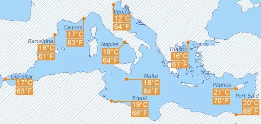 Aadria meri 11-18 Algarve 16 Antalya 21 Assoorid 18-20 Barcelona 15 Costa del Sol 16 Kanaari saared 19-21 Korfu 18 Küpros 20 Madeira 20 Mallorca 16 Malta 18 Must meri 9-14 Rimini 11