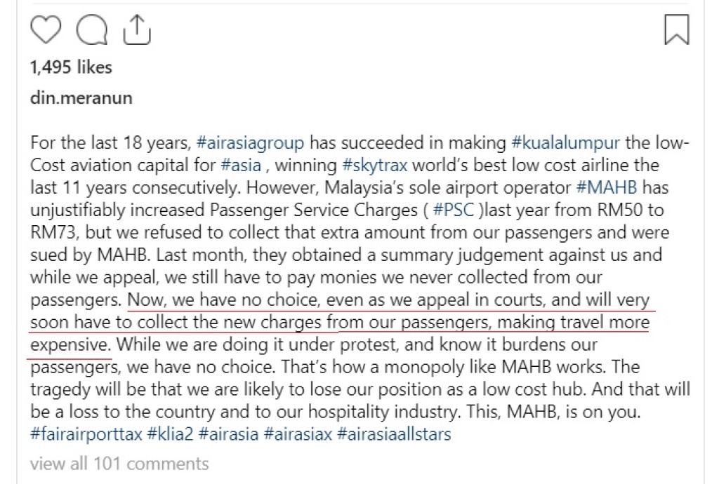 Samas on AirAsia pikalt vaielnud Malaisia lennujaamasid haldava Malaysia Airports Holdings Berhad-iga (MAHB) KLIA2 puudutava teenustasu üle (Passenger Service Charge, PSC). Alates 1. jaanuarist 2018 tõusis see 50 ringgiti pealt 73 ringgitini. AirAsia on pidanud seda põhjendamatuks, sest see on sama suur kui KLIA-s, kus tingimused on kaugelt paremad. Seetõttu pole AirAsia ka 23 ringgiti ehk 4,9€ suurust maksutõusu reisijatelt seni kogunud.