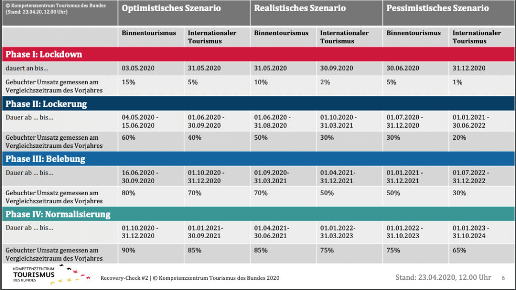 Saksamaa turismi kompetentsikeskus pani umbes 500 turismiga seotud inimese hinnangute põhjal kokku 3 võimalikku stsenaariumi (optimistlik, kõige reaalsem ja pessimistlik), kuidas turismi taastumise ajakava (pdf) võiks välja näha. Asja idee on anda turismisektorile inidikaatoreid tulevikuplaanide tegemiseks. Samas annab see võimalikest arengutest aimu ka reisijatele.