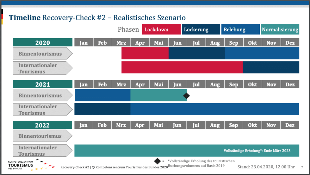 Kõige tõenäolisema stsenaariumi kohaselt võiks rahvusvaheline turism hakata normaliseeruma aprillis 2021 ehk aasta pärast. Enam-vähem tavapäraselt toimuks reisimine 2022. aastal, kuid taastumine 75% tasemele võrrelduna 2019. aastaga ei toimu enne 2023. aastat. Vähemalt Saksamaal arvestatakse lähiaastatel eelkõige siseriikliku turismiga.