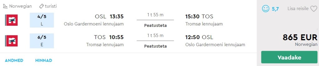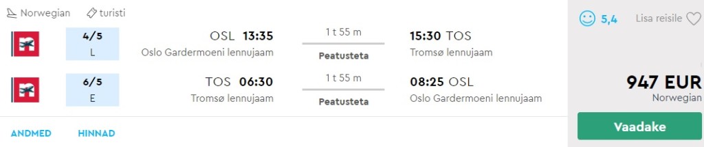 Oslo-Tromsø 4.-6. mai odavaim edasi-tagasi hind.